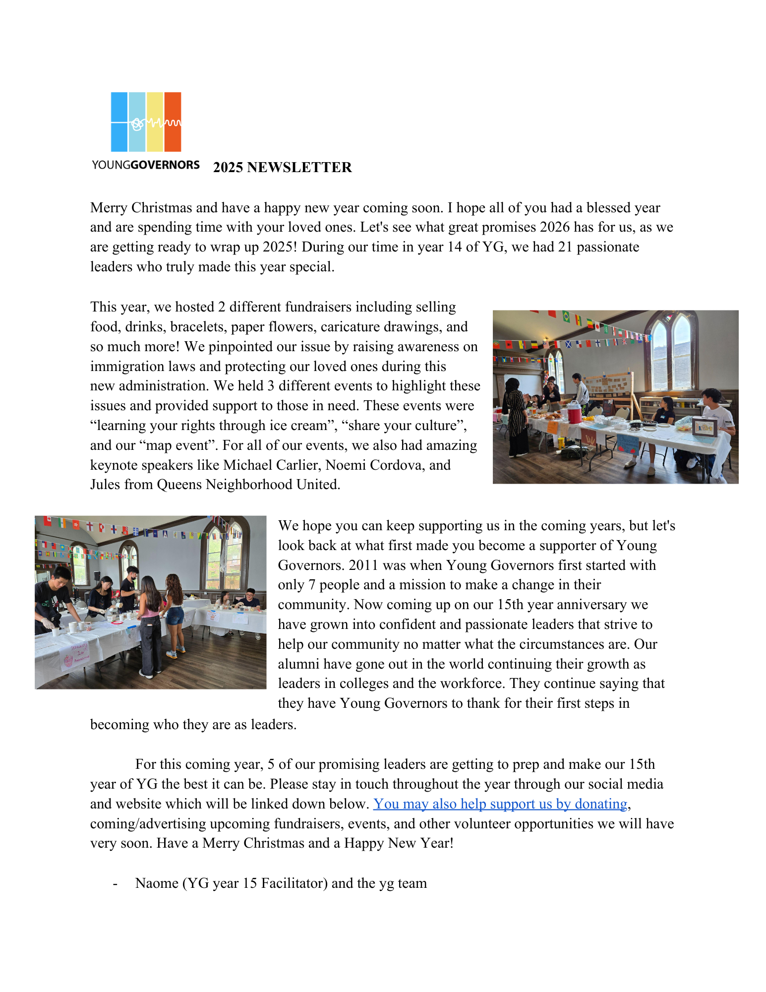 2025 was a very exciting year for Young Governors! It was the Young Governors’ 14th year and featured the largest cohort of 20 members! In 2025, Young Governors hosted 2 fundraisers, raising over $2700 to focus on our community issue: Civil Rights and Liberties. At our fundraisers, we sold an assortment of food ranging from pani puri, Oreo truffles, mango cream pie, and lemon bars. In addition, our community organizers showcased their creativity by selling homemade flowers, beaded bracelets, and crochet hearts!